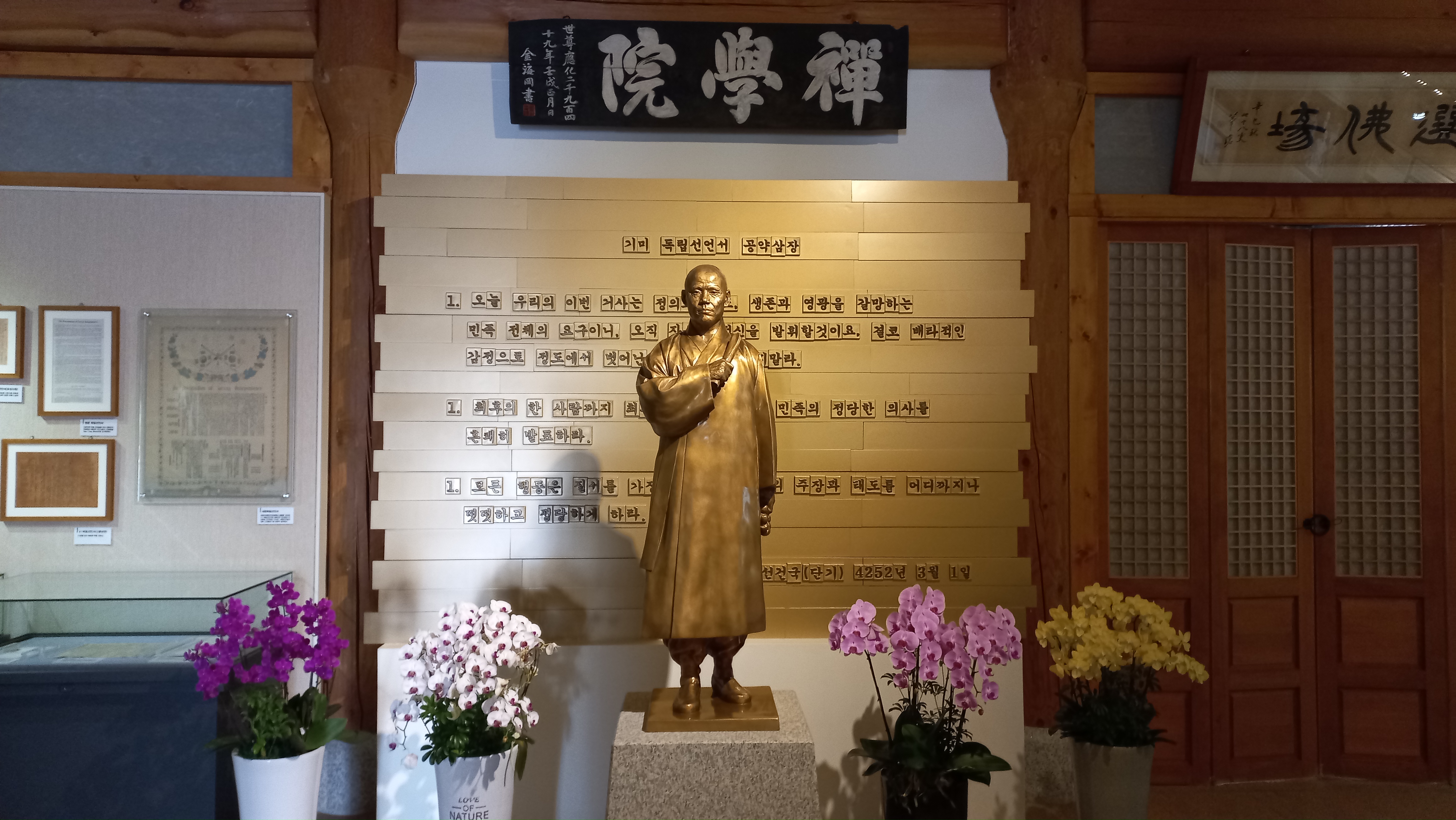 기미 독립선언서 공약 삼장과 그 앞에 놓인 동상은 만해 한용운 스님입니다.