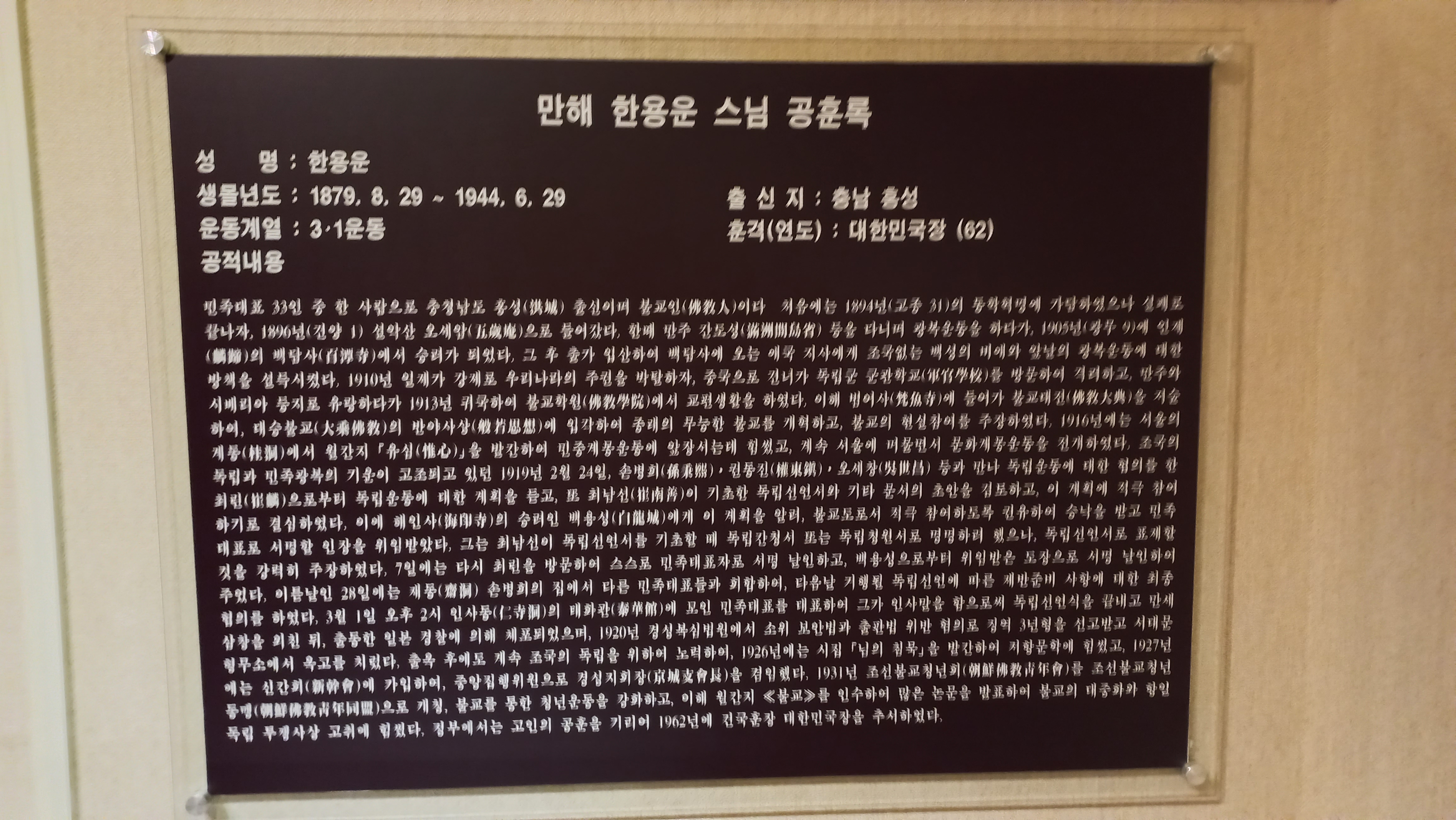 만해 한용운 공훈록