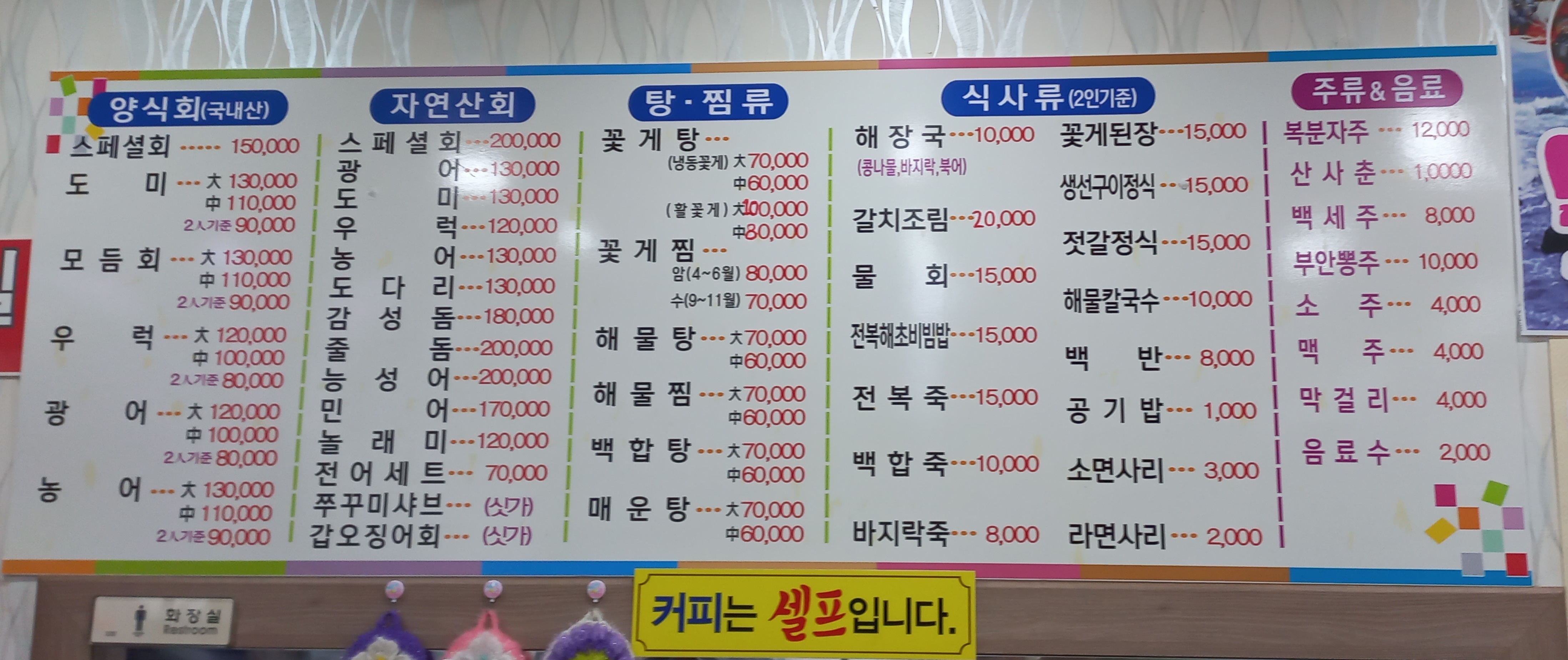 격포항과 채석강을 구경하고 저녁식사를 자연산회로 거하게 먹은 대신수산횟집 식당.
