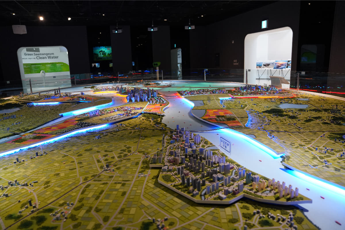 지하 1층, 지상 3층 규모로 전시실을 돌아보면 우리나라 간척 기술의 발전사와 국토 이용의 문제점, 상류지역의 수질과 개선대책, 방조제로 인한 수질 문제, 친환경적인 개발, 우리나라 철새 도래지, 새만금의 모형과 위성사진, 간척 이후 생성된 갯벌, 새만금지구, 시대별 간척지, 방조제 단면 모습 재현, 사업의 효과와 미래의 발전상 등 간척 사업과 관련된 모든 내용을 알 수 있습니다.