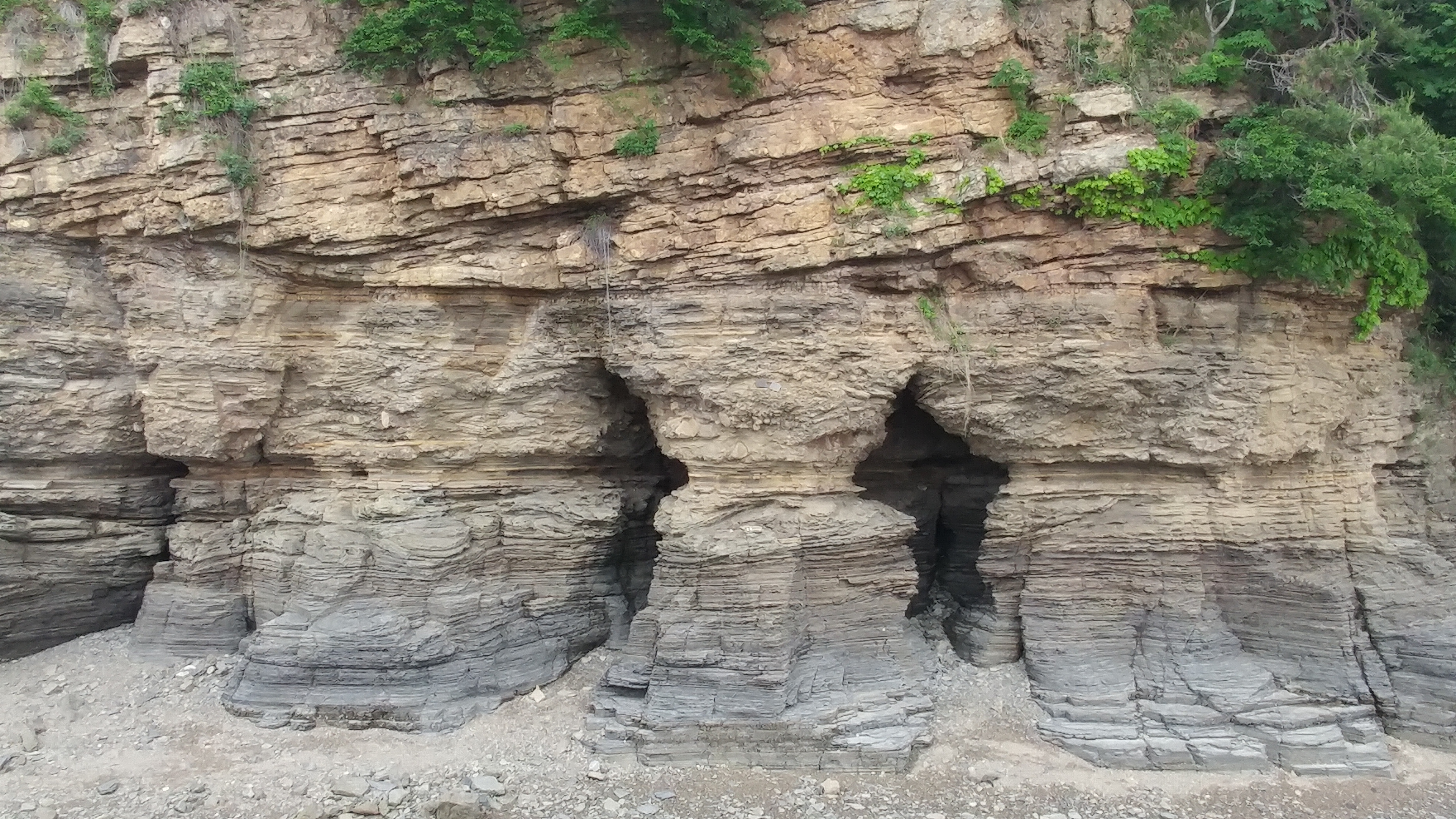 위도에선 안산암과 유문암질 화산력 응회암의 경계, 화산력 응회암의 하부에 나타나는 유동구조, 안산암의 자가각력암 그리고 중성암맥의 관입구조를 관찰할 수 있답니다.