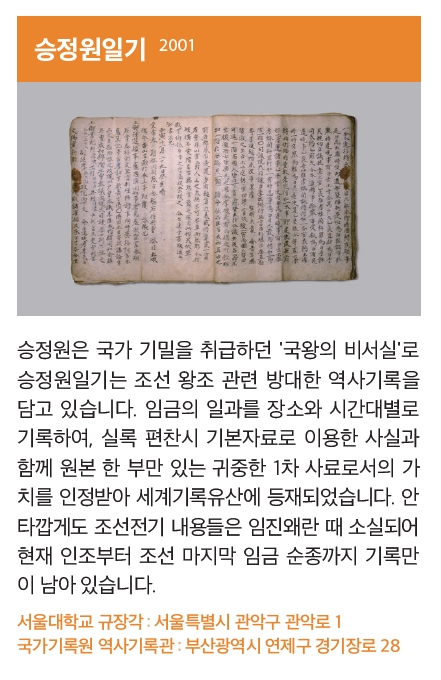 임금의 일과를 장소와 시간대별로 기록하여, 실록 편찬 시 기본자료로 이용한 사실과 함께 원본 한 부만 있는 귀중한 1차 사료로서의 가치를 인정받아 세계기록유산에 등재되었습니다.