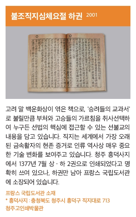 청주 흥덕사지에서 1377년 7월 상/하 2권으로 인쇄되었다고 명확히 쓰여 있으나, 하권만 남아 프랑스 국립도서관에 소장되어 있습니다.