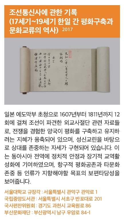 일본 에도막부 초청으로 1607년부터 1811년까지 12회에 걸쳐 조선이 파견한 외교사절단 관련 자료들로, 전쟁을 경험한 양국이 평화를 구축하고 유지하려는 지혜가 응축되어 있으며, 성신교린을 바탕으로 상대를 존중하는 자세가 구현되어 있습니다.