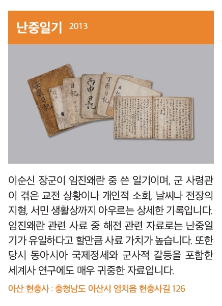임진왜란 관련 사료 중 해전 관련 자료로는 난중일기가 유일하다고 할 만큼 사료 가치가 높습니다.