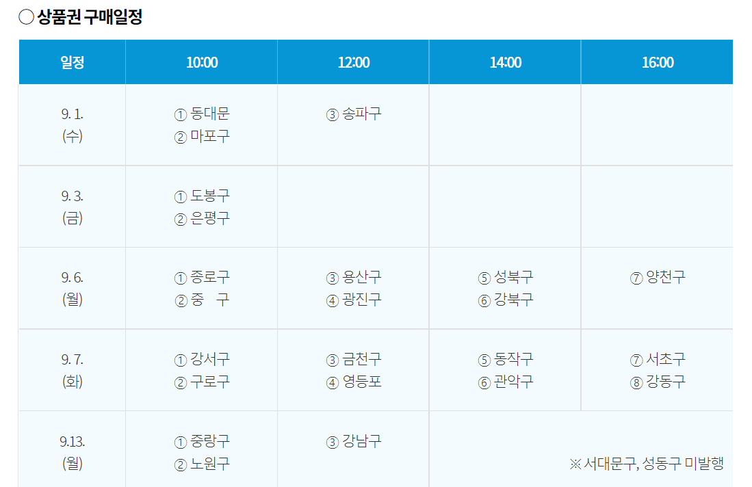 9월 1일에는 동대문구와 마포구, 송파구가 순차적으로 판매가 이루어지고, 3일에는 도봉구와 은평구, 6일에는 종로구와 중구, 용산구와 광진구, 성북구와 강북구, 양천구에서, 7일에는 강서구와 구로구, 영등포구와 금천구, 동작구와 관악구, 서초구와 강동구가, 13일에는 중랑구와 노원구, 강남구가 각각 판매가 시작되며, 서대문구와 성동구는 이번 3차 발행을 하지 않습니다.