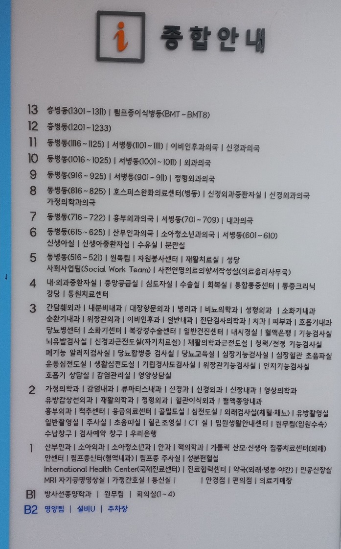 1층에서 4층까지가 각종 진료과와 접수센터 등이 있고, 5층부터 13층까지 병동으로 구성되어 있습니다.