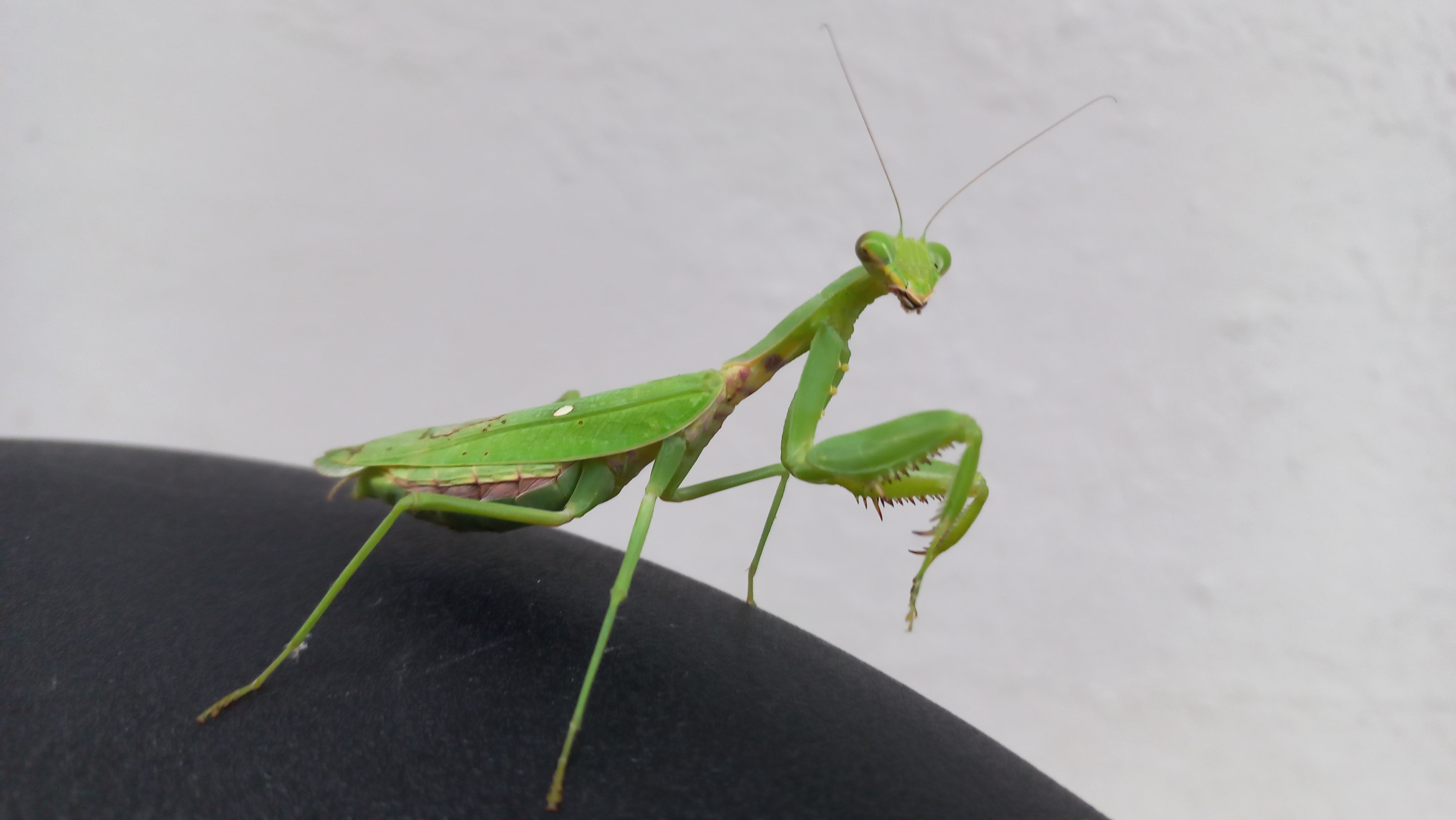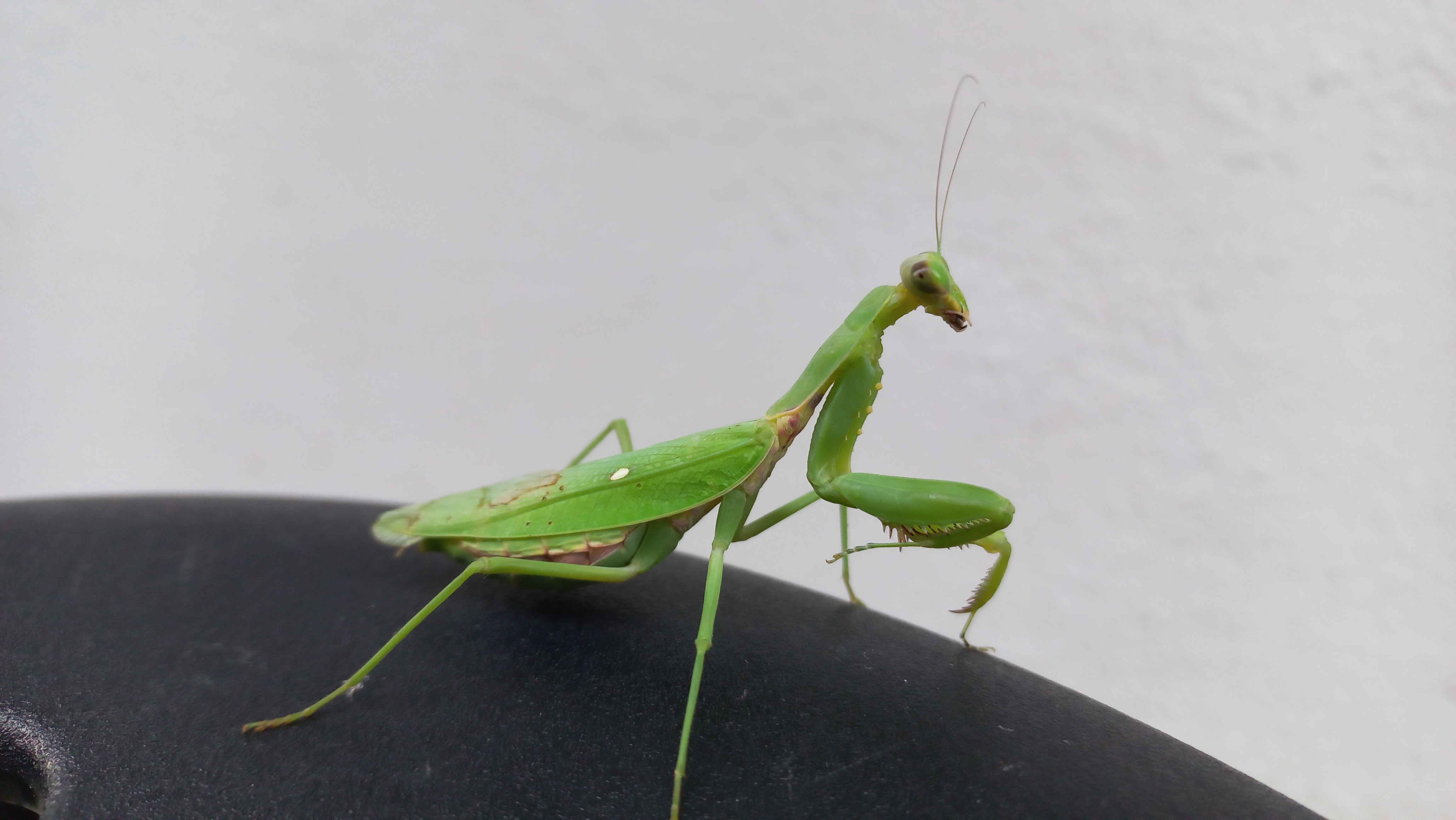 오래된집 앞 의자에 앉아있는 사마귀 발견
