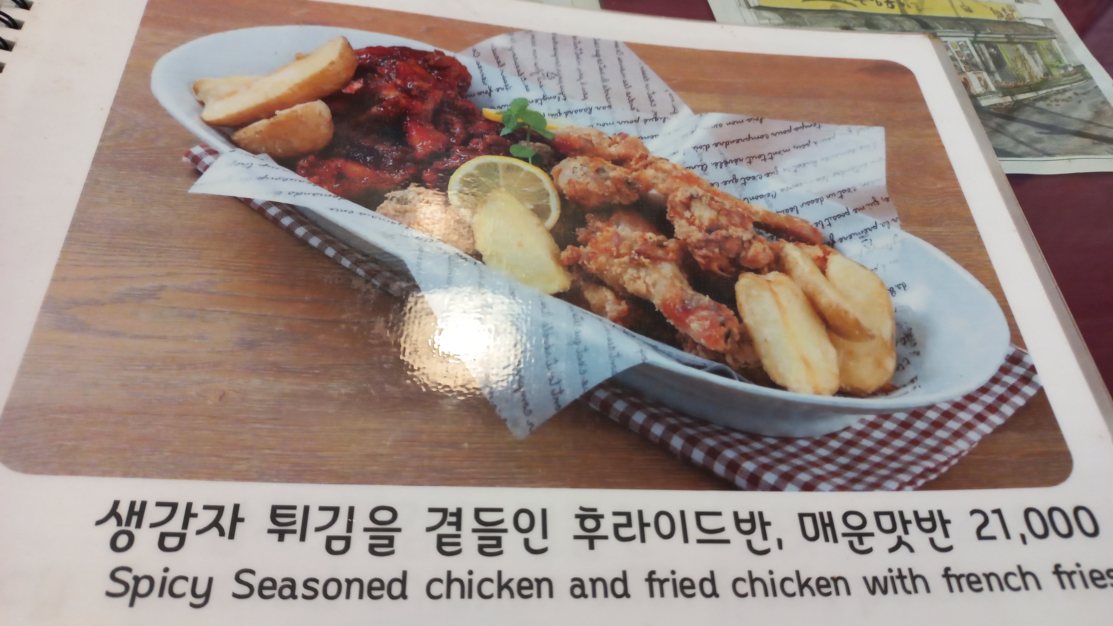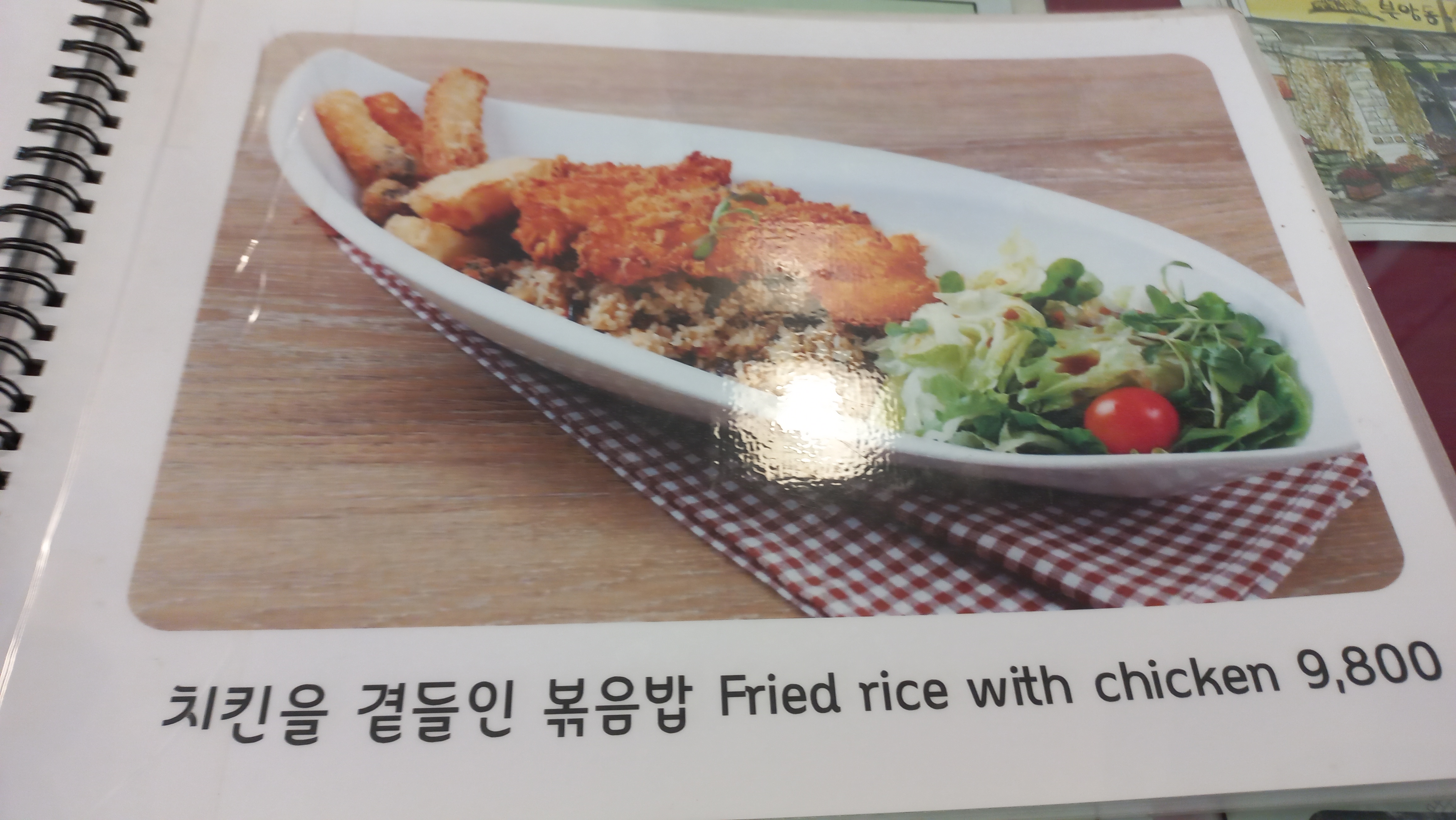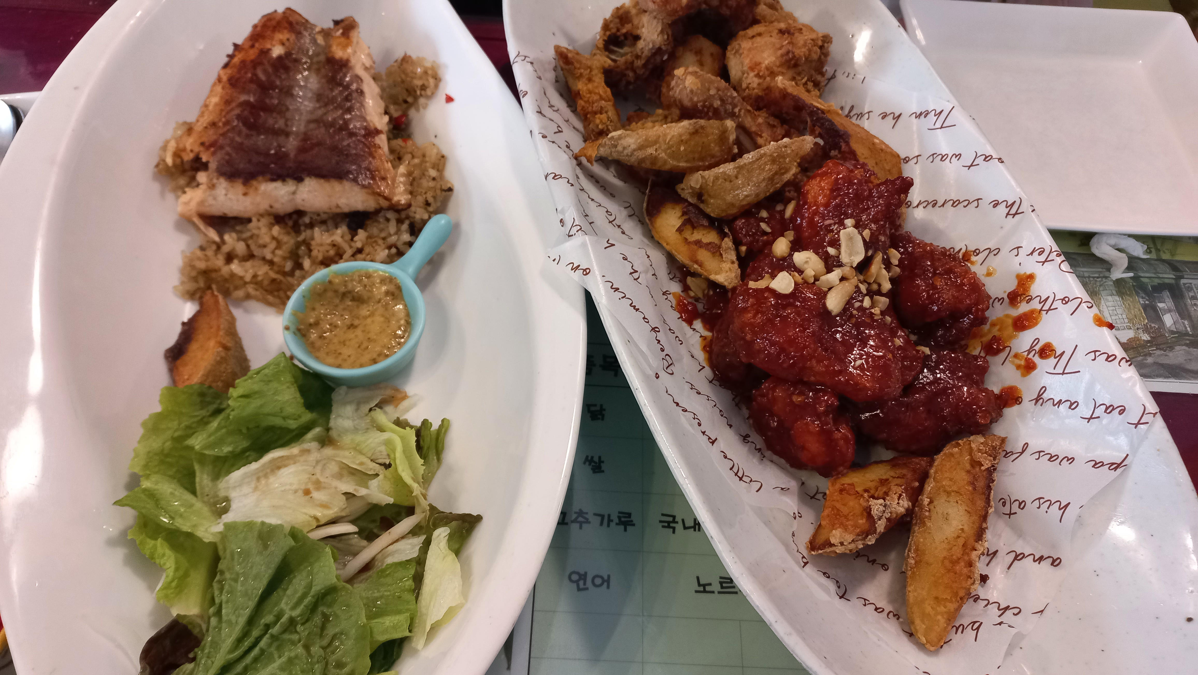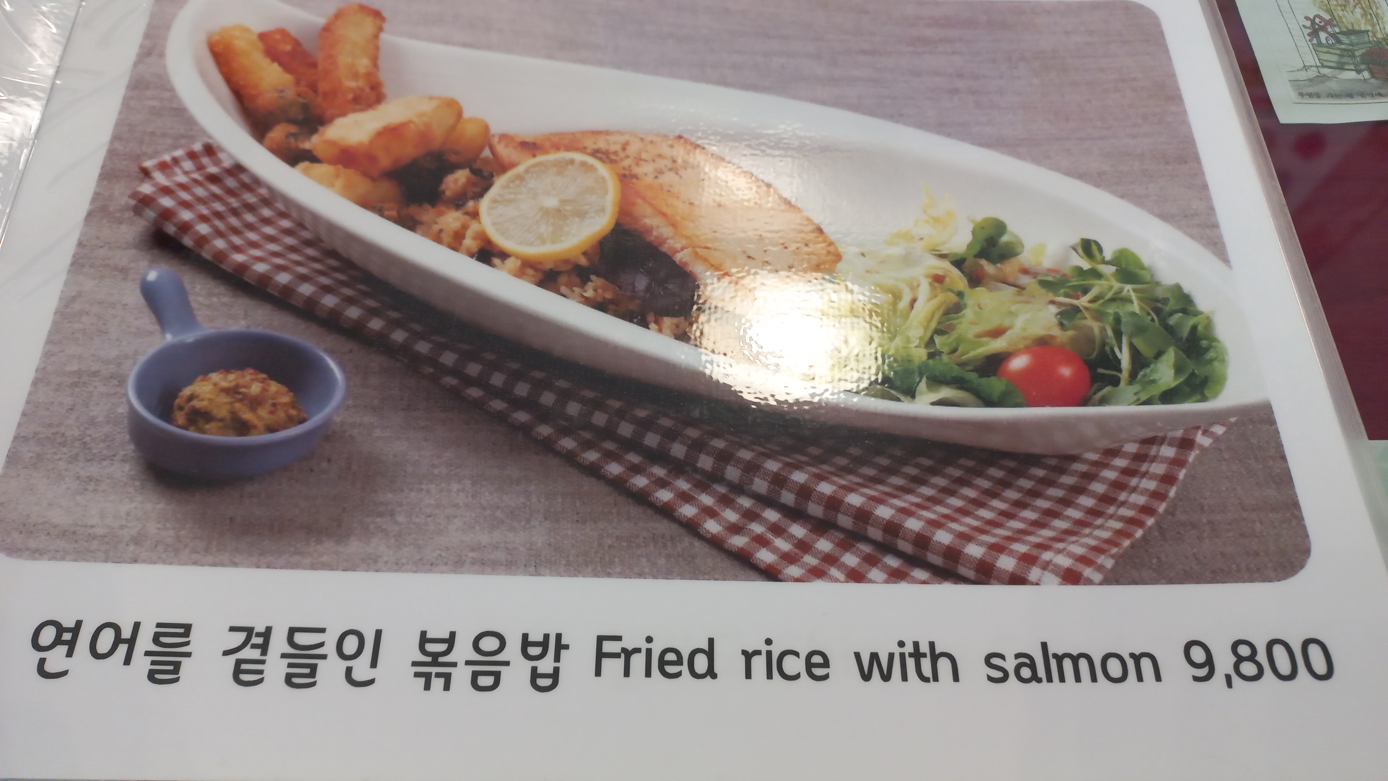 우리가 주문한 메뉴는 연어를 겉들인 볶음밥과 후라이드반 매운맛 반 치킨입니다.