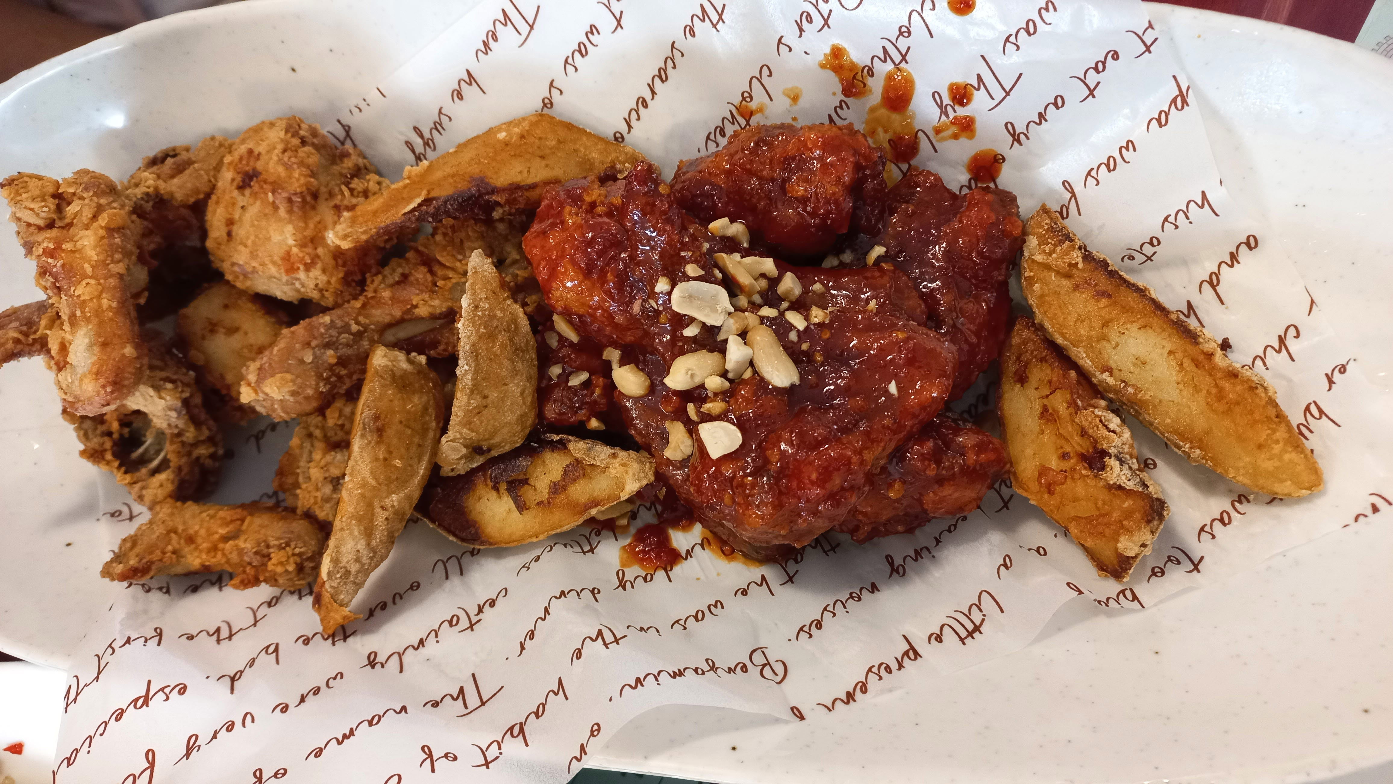 생감자 튀김을 곁들인 후라이드 반, 매운맛 반